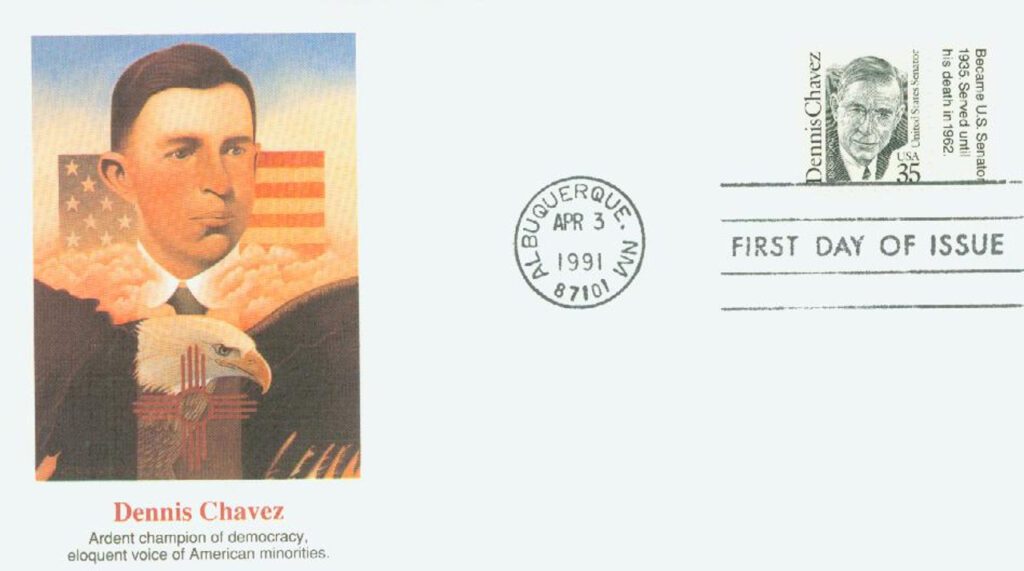 The stamp at the center of this controversy was a Great Americans issue honoring Dennis Chavez, the first American-born Hispanic person to serve in the US Senate. The stamp was announced a year earlier in February 1990. At that time, the denomination was unknown as new rates were expected in 1991. By 1991, the denomination was set at 35¢, which was the rate for a half-ounce stamp to Mexico.