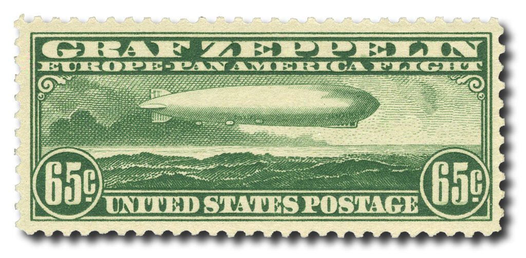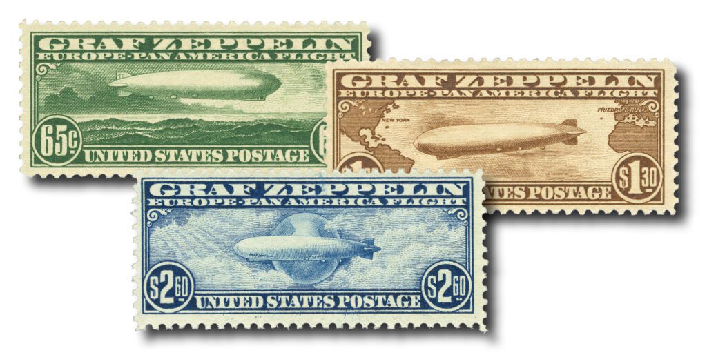 Because the Graf Zeppelin carried so much mail, postal administrations quickly recognized the opportunity to issue special stamps. The most famous of these are the United States Graf Zeppelin stamps of 1930. This striking set of three—65¢ green, $1.30 brown, and $2.60 blue—was produced for the airship’s Pan-American flight, which traveled between Europe and the Americas. The designs showed the Graf Zeppelin crossing oceans and continents, symbolizing the promise of international air travel.