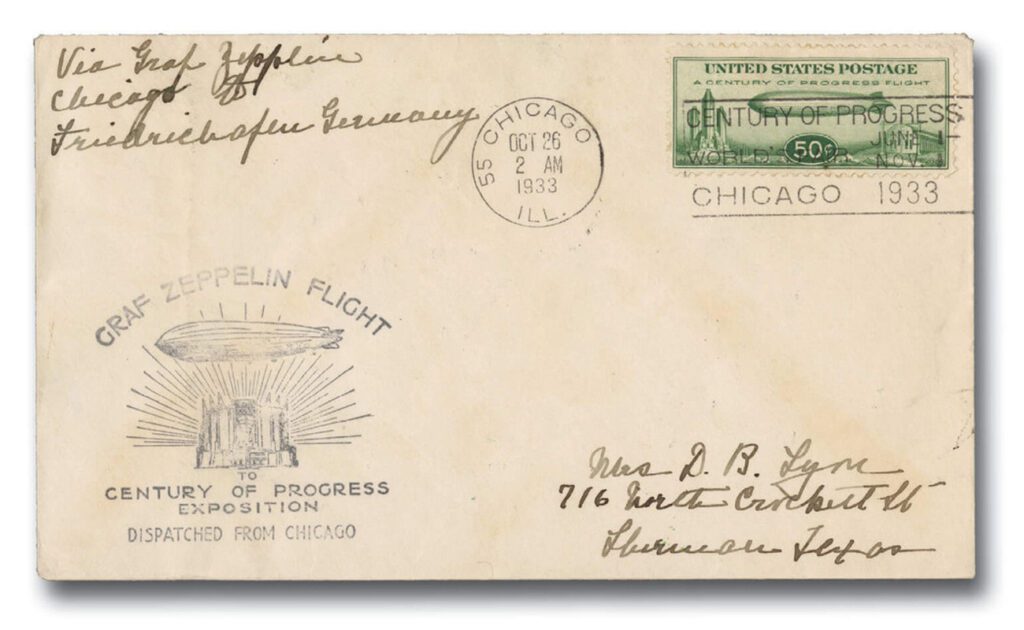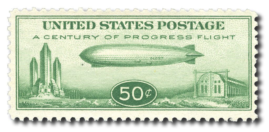 Not every collector could manage the high cost of the 1930 Zeppelin set, so the Post Office tried again in 1933 with the 50¢ “Baby Zep.” Issued to mark the Century of Progress Exposition in Chicago, this smaller and more affordable stamp pictured the Graf Zeppelin over the fairgrounds. While still expensive for the time, it was far more attainable than the earlier set and allowed more collectors to participate in the excitement of Zeppelin mail. The Baby Zep quickly became a beloved issue, and today it remains a favorite for those who want a Zeppelin stamp without the steep price tag of the 1930 set.
