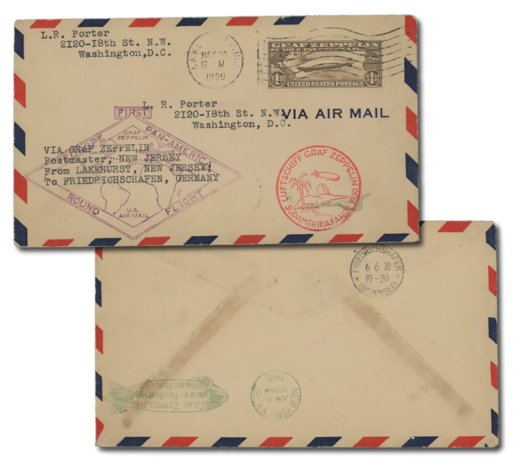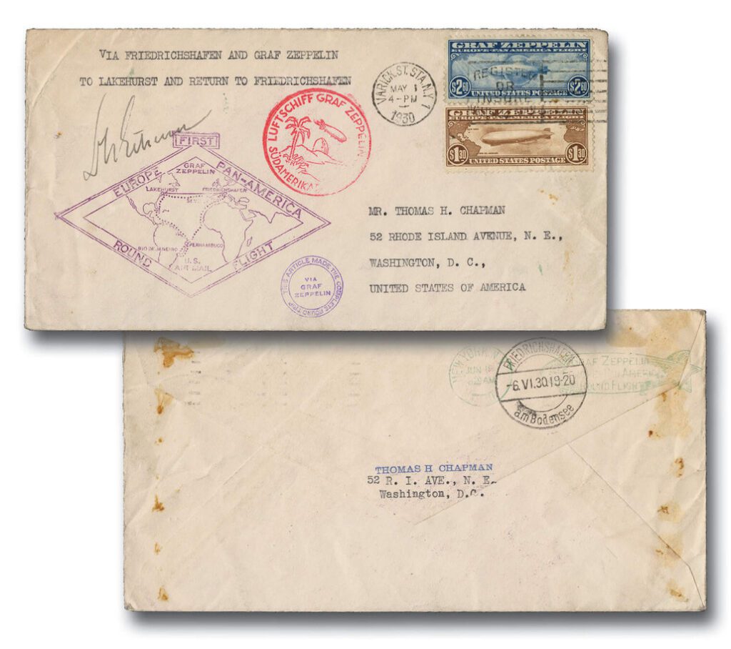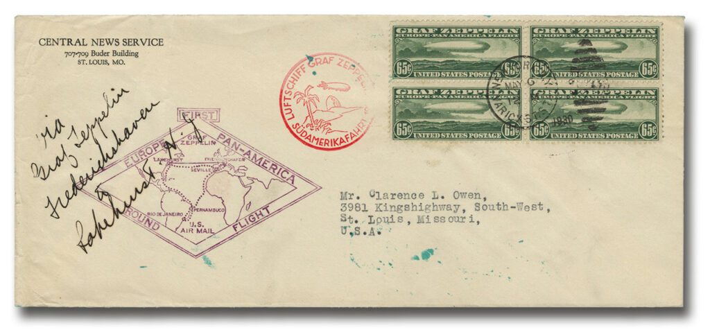 Over nearly a decade of service, the Graf Zeppelin flew hundreds of flights across Europe, North and South America, and even into the Arctic. These voyages carried passengers, cargo, and—most importantly for collectors—mail. Each letter and postcard flown aboard the airship became a piece of living history, marked with special cachets and postal markings that recorded its journey through the skies.