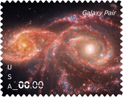 This new Priority Mail Express stamp features another astounding image captured by NASA’s James Webb Space Telescope. The stamp features a composite image from the Webb and Hubble Space Telescopes titled Galaxy Pair. It reveals a view of two interacting galaxies, IC 2163 and NGC 2207, located approximately 80 million light-years from Earth, offering a glimpse into the dynamic processes that shape our universe. Greg Breeding, an art director for USPS, designed the stamp, using a photo courtesy of NASA.
