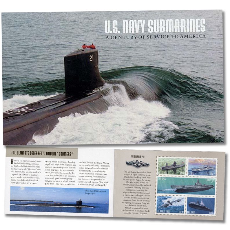 Issued in 2000, the US Navy Submarines unique Prestige Booklet is the first ever created by the United States. It contains two panes of five stamps each, full-color photographs of submarines, an informative history and a decorative selvage. Each of the stamps showcases a different class of submarine, providing a wonderful overview of the U.S. fleet.