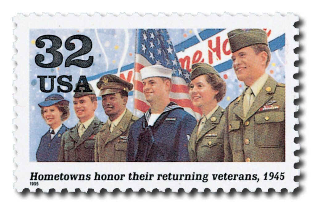 The Hometowns Honor Their Returning Veterans stamp is part of the World War II: 1945 – Victory at Last se-tenant issued in 1995 to commemorate the 50th anniversary of the war’s end. This particular design captures one of the most moving scenes in postwar America—the joyful parades and heartfelt welcomes that greeted soldiers as they returned home. With flags flying and families cheering, it symbolizes the relief, gratitude, and unity that swept the nation as peace was finally restored.