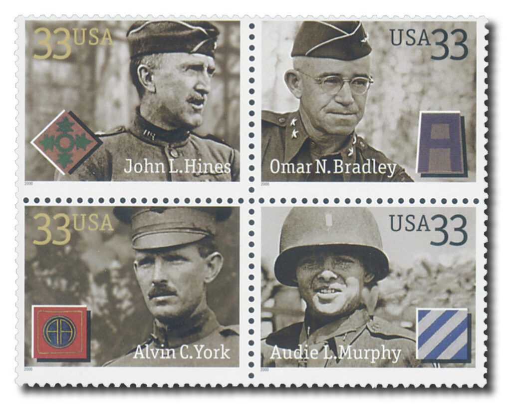 In 2000, the USPS launched the first installment of the Distinguished Servicemen Series with four 33-cent stamps. Issued May 3rd in Washington, DC, these stamps feature some of the Army’s greats: John L. Hines, Omar N. Bradley, Alvin C. York and Audie L. Murphy. Each stamp features a black-and-white portrait plus the shoulder-sleeve insignia of the unit in which the person served. The idea was not just to commemorate the four individuals, but to pay tribute to all American soldiers—honoring the service of many through these few.