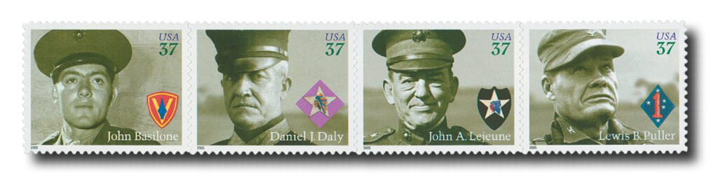 The series continued in 2005 with a salute to four legendary Marines. Issued on November 10—the Marine Corps’ 230th birthday—the 37-cent stamps honored John A. Lejeune, Lewis B. “Chesty” Puller, John Basilone, and Daniel J. Daly. Each man represented the Marine Corps’ highest traditions of leadership, valor, and sacrifice. It was also the first time the Postal Service had ever featured individual Marines on stamps, making the issue a proud moment for the Corps (as a group, Marines first appeared on the 1945 Raising the Flag on Iwo Jima stamp).