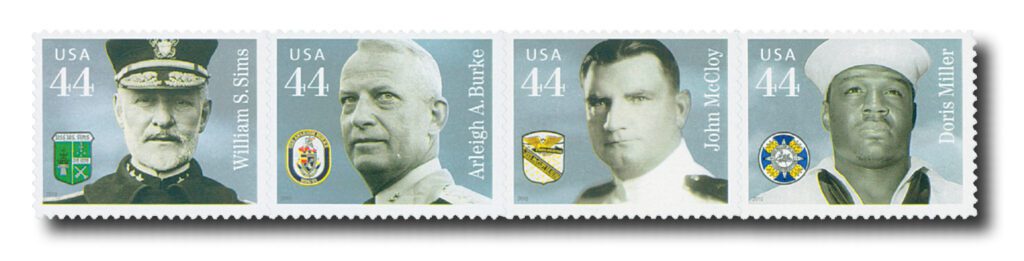 The final installment came on February 4, 2010, with four 44-cent stamps celebrating distinguished sailors of the US Navy. The set honored Admiral William S. Sims, Admiral Arleigh A. Burke, Lieutenant Commander John C. McCloy, and Doris “Dorie” Miller—the first African American to receive the Navy Cross. Each stamp showed the honoree along with a ship named in their memory, symbolizing their lasting influence on naval history. With this issue, the Postal Service completed a decade-long tribute to America’s armed forces and the men whose service and heroism defined them.