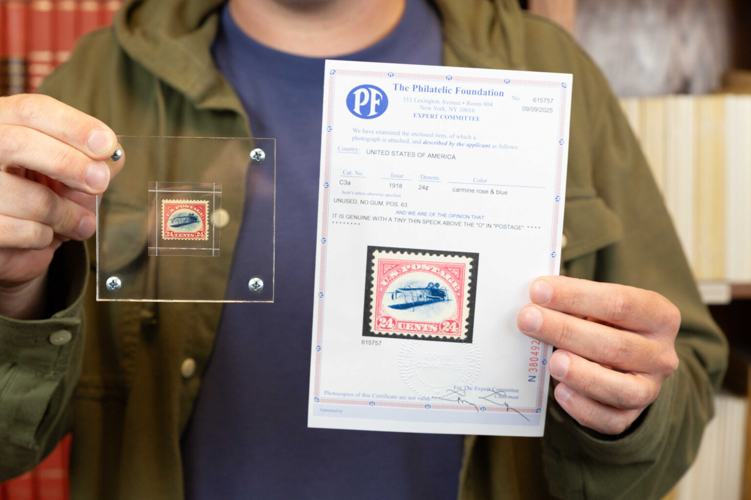 Robey’s search of other post office branches was unsuccessful. He returned to his office and shared his news with a fellow stamp collector, who immediately left the office to search for more error sheets. His activities alerted authorities, who arrived at Robey’s office less than an hour after he returned from the post office. The officials threatened to confiscate the sheet of inverts, but Robey stood firm.