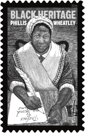 The 49th Black Heritage stamp commemorates Phillis Wheatley (circa 1753-1784), the first author of African descent in the American Colonies to publish a book. As an enslaved woman with an education and prominent social connections, Wheatley occupied a unique and remarkable place in Colonial Boston, and she is often called “the mother of African American literature.” Antonio Alcalá, an art director for USPS, designed the stamp with a portrait of Wheatley by internationally acclaimed artist Kerry James Marshall. The Phillis Wheatley stamp will be issued Jan. 29 in Boston.