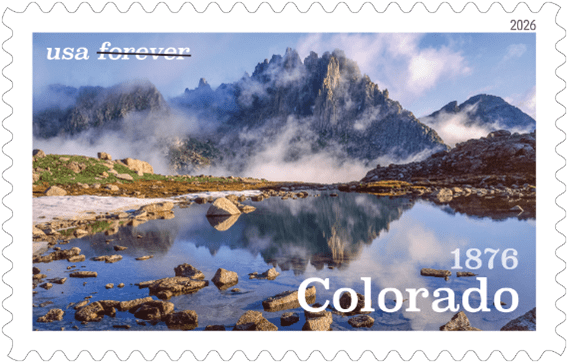 In 2026, Colorado will be honored with a stamp for its 150th anniversary. Renowned for its breathtaking landscapes and the awe-inspiring beauty of the Rocky Mountains, our 38th state joined the Union 100 years after the United States declared independence from the United Kingdom. The Colorado Statehood stamp features a photograph of Jagged Mountain, located in the Weminuche Wilderness area of the San Juan National Forest. Derry Noyes, an art director for USPS, designed the stamp with an existing photograph by Colorado nature photographer John Fielder (1950-2023). The Colorado Statehood stamp will be issued Jan. 24 in Denver.