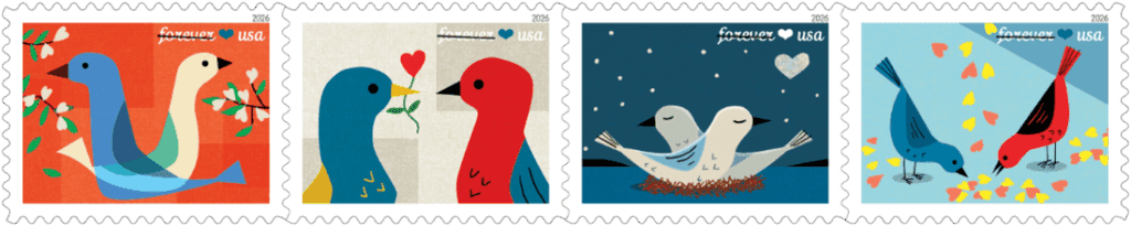 Inspired by both mid-century American design and Japanese children’s book illustrations, James Yang created the art for this year’s Love stamps. His illustrations show pairs of stylized birds in a colorful world in which hearts appear, like love itself, in sweet and surprising ways. Ethel Kessler, an art director for USPS, designed the stamps.