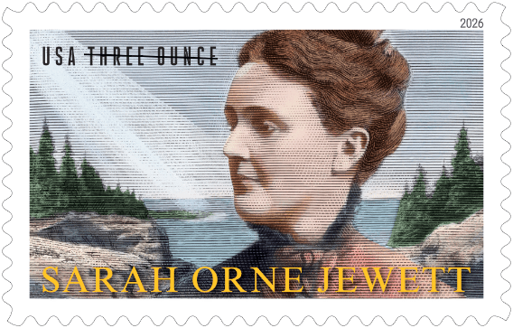 The 35th stamp in the Literary Arts series honors Sarah Orne Jewett (1849-1909), a lifelong resident of Maine and a foundational figure in American literary regionalism. Her strong female characters have led to a renewed interest in her work, which includes hundreds of short stories as well as novels, poetry, and essays. Ethel Kessler, an art director for USPS, designed the stamp using an original portrait of Jewett by Mark Summers, with the Maine coast as background, broken by a large ray of sunshine that evokes a scene from her best-known novel, “The Country of the Pointed Firs” (1896).