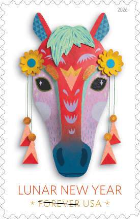 In 2026, USPS will honor the Year of the Horse with the seventh stamp in the current Lunar New Year series. Lunar New Year — also referred to as Chinese New Year or Spring Festival — is one of the most widely celebrated cultural holidays in the world. Beginning in 2020, the Postal Service introduced its latest Lunar New Year stamp series, the third in the organization’s history. This collection features paper-cut masks by artist Camille Chew depicting each of the 12 animals of the Chinese zodiac. Antonio Alcalá, an art director for USPS, designed the stamp using a photograph of the mask by Sally Andersen-Bruce. The Lunar New Year: Year of the Horse stamp will be issued Feb. 3 in Houston.