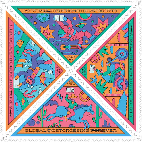 These stamps recognize Postcrossing for highlighting the fun of receiving real, personalized mail and promoting greater understanding across countries and cultures. Since 2005, Postcrossing has inspired more than 805,000 people in more than 200 countries and territories to send more than 85 million postcards to eager recipients around the world. These stamps may be used to send a postcard or letter from the United States to any country to which First-Class Mail International service is available. These stamps will have a postage value equivalent to the price of the single-piece First-Class Mail International first-ounce machinable letter at the time of use. Issued in panes of eight, these triangular stamps’ colorful illustrations by Jackson Gibbs playfully acknowledge the great distances postcards often need to travel and the efforts of the dedicated workers who help them reach their far-off destinations. Antonio Alcalá, an art director for USPS, designed the stamps.