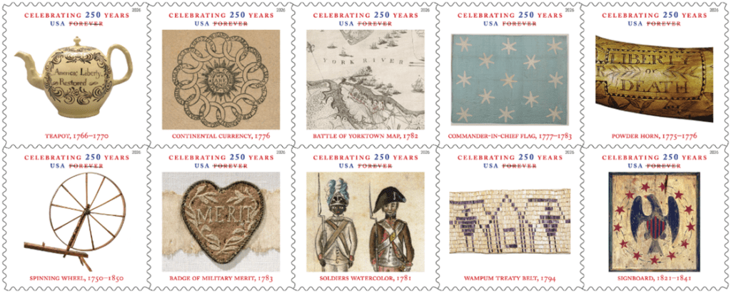 To mark the 250th anniversary of the American Revolution, the US Postal Service presents this 20-stamp prestige booklet as part of a broader USPS initiative commemorating 250 years of American independence. Centered on 10 compelling objects from the era, the booklet offers a vivid connection to the symbols and stories that helped shape the United States. Reflecting the booklet’s focus on tangible history, the featured objects range from simple tools to powerful symbols of national purpose drawn from museum collections and historical archives. To complement the stamps, the booklet also includes images and background text that place each object in historical context, connecting everyday experiences to the larger forces at work during the Revolutionary era. Ethel Kessler, an art director for USPS, designed the booklet and stamps.