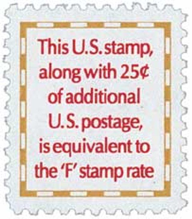It was heavily criticized by the public and philatelic press for its simple design.  One said it looked like the preamble to the US Constitution.  Another said the next rate change stamps would be inscribed “G” for “Generic.”  An English teacher also criticized the punctuation, saying “The commas separating the phrase ‘along with 25¢ of additional U.S. postage’ make it non-restrictive, thereby having no real bearing on the message in the sentence.  To be correct, the stamp needs a simpler statement: “This U.S. stamp plus 25¢ additional U.S. postage is equivalent to the “F” stamp rate.’  Please note the period at the end of my sentence.  The post office has evidently stopped using periods in its mad dash – no pun – to use all the commas it can!”