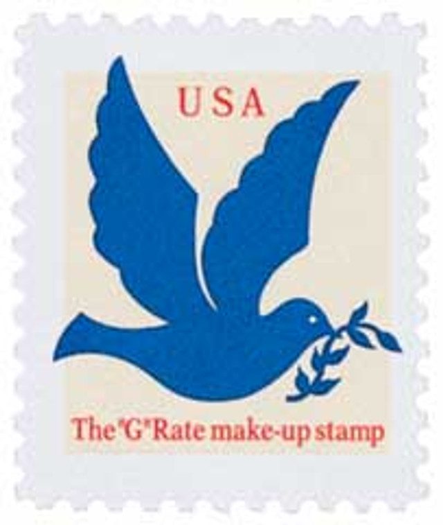 When the next rate change came in 1994, the USPS heard the complaints about the 1991 stamp and opted for a more aesthetic design.  People would be more familiar with the stamp’s purpose, so fewer words were needed.  In the end it pictured a dove carrying an olive branch with the words, “The ‘G’ Rate make-up stamp.”  A third make-up rate design was produced in 1998 to accompany the H Rate stamp.