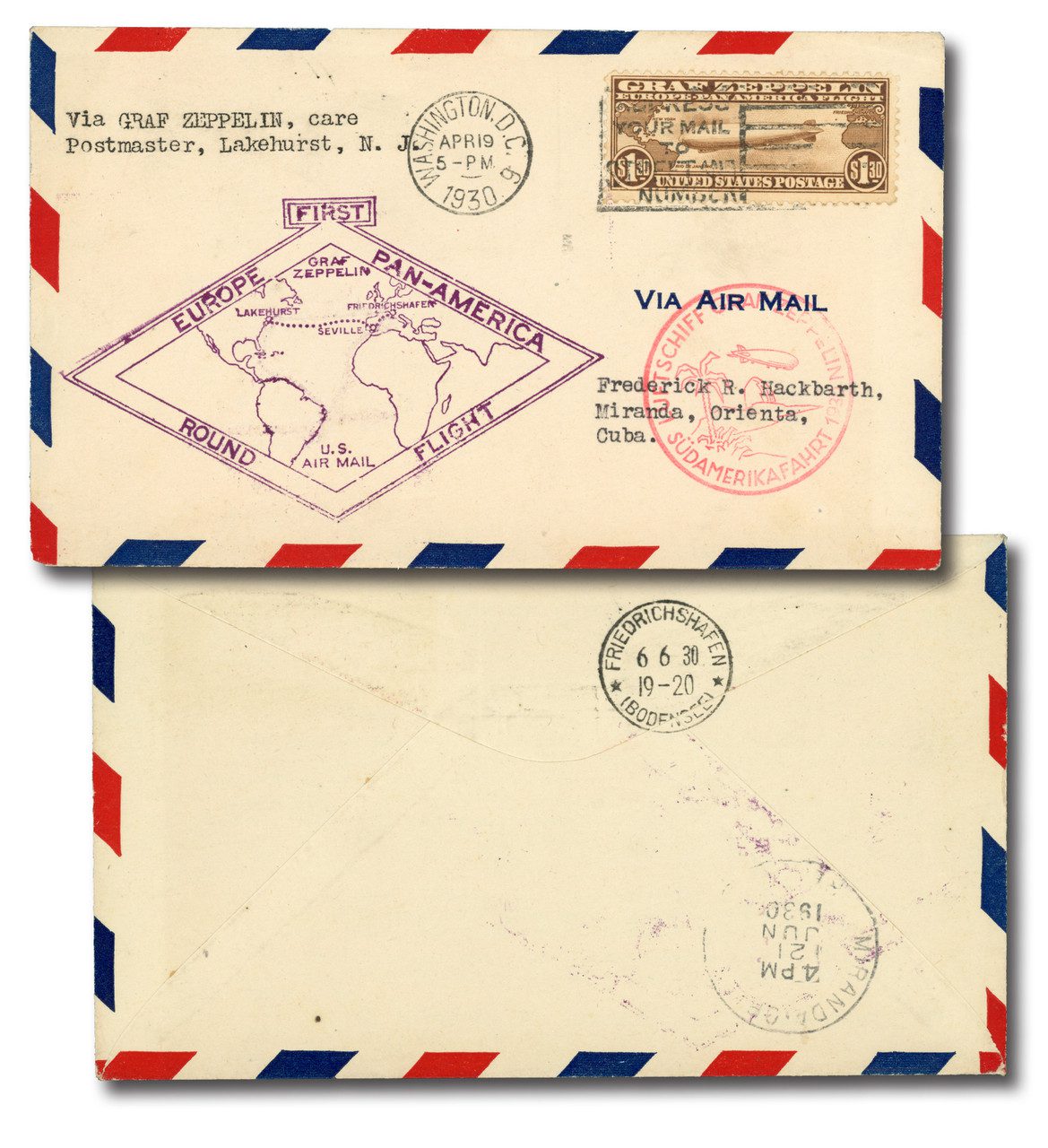 The Graf Zeppelin stamps went on sale on April 19, 1930, in Washington, DC. They were then made available for sale at select post offices in other cities two days later. The 65¢ green issue (Zeppelin over the Atlantic) paid the postage for a post card traveling via Graf Zeppelin one way. The $1.30 brown issue (Zeppelin between Continents) paid the postage of a letter going one way. The $2.60 blue issue (Zeppelin and Globe) paid the postage on a letter going the full route. This included a trip by steamer from New York to Germany, via Spain, to South America and North America.